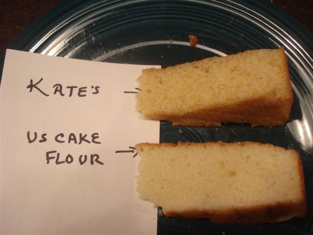 A few weeks ago, Woody made 2 yellow butter cakes – one with bleached cake flour and the second with kate flour. On the same day, I also made 2 yellow butter cakes – one with kate flour from the same batch as the flour I mailed to Woody and the second with a freshly-made batch of kate flour. My cakes were pretty much the same as each other, which showed that kate flour stores … and, more importantly in terms of the testing, that Woody could be fairly sure that the cake he was making was representative of cakes made with kate flour in the UK. From Woody’s cakes therefore, we were able to directly compare the baking performance of side-by-side examples of cake and kate flour.