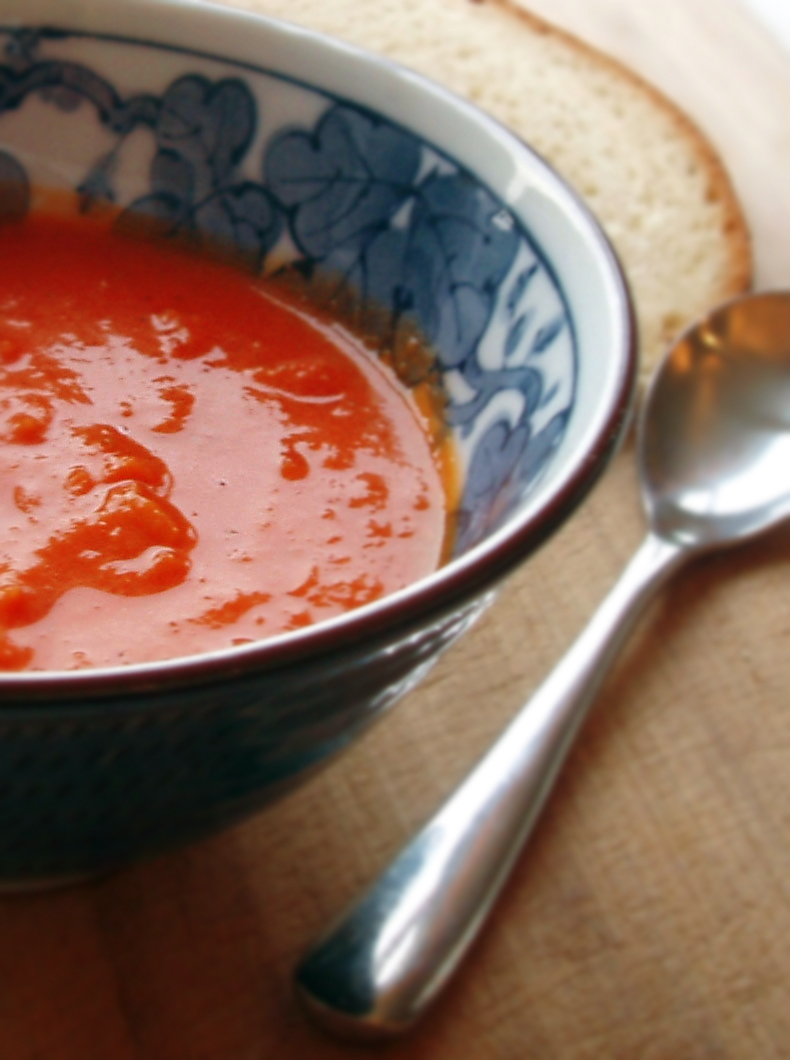 With such preamble, I’m hoping to get in my excuses early for a forthcoming lack of posting while our kitchen is in boxes. Before I return to my packing duties though, here’s a warming tomato soup I made at the weekend to stave off the cold winter weather.