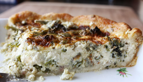 Roll out the pastry and use to line the base of your tart tin. Blind-bake if you wish (confession time – I don’t always do this; yesterday, I brushed the unbaked pastry base of the quiche with a little melted butter, then covered it with clingfilm and popped it back in the fridge. The butter hardens again in the fridge so that it forms a protective layer between the pastry and the sloppy filling in the oven, which allows the pastry just enough time to get a head start in the cooking process before the butter melts and the bottom comes into contact with the filling).