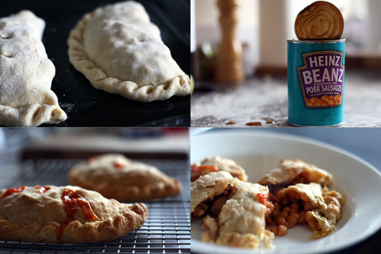 Spoon four mini sausages (assuming there are 8 in each tin. Can you tell I know my Heinz baked beans …?) and a quarter of the baked beans into the centre of each pastry circle. Brush the edges with water and stretch the lower half of the circle up and over the filling. Seal the edges and crimp. Snip two or three slits in the top of each pasty to let out the steam (and sauce!).