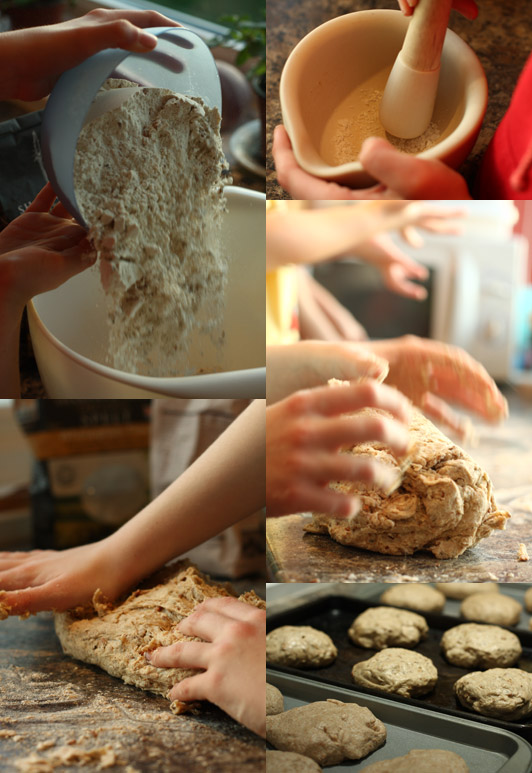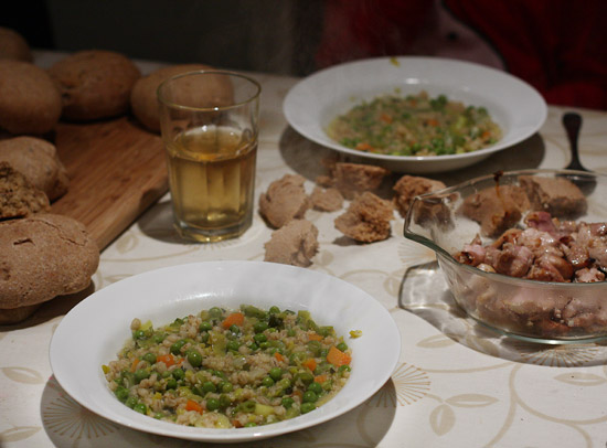 For our own feast, we decided to prepare a broth of leeks, beans, peas and barley in the closest thing we have to a cauldron and hearth fire (aka a red Le Creuset pot and an induction cooker zone). Each one of my three children wanted to make their own batch of bread buns using different flours from each other so that they could compare the tastes of the various wholegrains. Whilst pork or beef would perhaps have featured more regularly on an Anglo-Saxon table, M was adamant that she wanted chicken. Not having a handy spit tucked away in the corner of the kitchen, we did the next best thing and spiked chicken pieces onto barbeque skewers.
