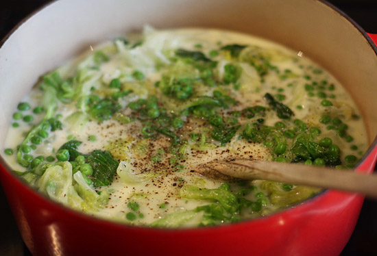 Add the stock and frozen peas. Bring to the boil and simmer until the peas are tender.