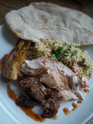 5 – Remove from the oven and allow to rest for 15 minutes. Make a quick sauce by deglazing the pan with a little water then stirring in some honey. Calve the meat with a slice of the stuffing and serve with cous cous, flatbreads and a good drizzle of the sweet, spicy and sticky sauce.